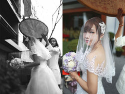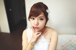 蕾絲旗袍領特別容易流露女人東方溫柔婉約氣息,女主人公舉手投足間更加韻味迷人,,彷彿淺淺一抹微笑輕易就能融化對方的心;刻意搭配不對稱鏤空蝴蝶耳環、盤扣髮夾及大小珍珠戒指,展現氣質典雅的形象,將東方新嫁娘嬌羞柔媚精緻呈現!