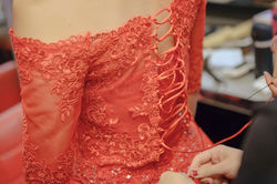 復古改良蕾絲小拖尾魚尾旗袍又是另一款風情萬種的復古佔據視覺,鮮紅色調想要故意忽略都困難,紅色唇膏配上海姑娘復古捲髮;綰髻系列髮飾、紅珠耳環、立體蝴蝶紅甲片以及紅色高跟鞋,整個人喜氣華麗到最高點卻又優雅到沸騰!