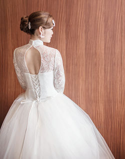 赫本風格復古時尚極具氣質高雅,為了更接近赫本女神的氣勢,刻意挑選大皇冠、垂墜式耳環及V型款項鍊;微暗場地依舊能對閃閃發亮大皇冠行注目禮,而禮服上的蕾絲繡上珠片亮鑽,以拼接方式加強收腰,利用褶皺設計營造出裙擺層次感;展露復古優雅絲絲入扣,把最完美的王妃風範淋漓盡致地詮釋!