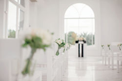 一身氣質白西服,展現出白馬王子風範,花邊襟襯衫突顯男主人公尊貴與氣勢感,搭配精緻鑽領結,畫龍點睛的亮點,完全撐得起這場莊重神聖教堂婚禮的重量。