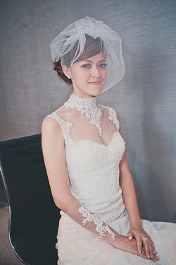 短髮女主人公雖然不像長髮變化比較多,收起髮絲以俐落樣貌拜見父母長輩,將髮頂營造出蓬鬆圓弧狀髮尾層層燙捲收於腦後;髮色部分只要亞麻或是亮一點色系即可;妝容設定能顯現出白裡透紅好膚色妝感達到輕薄透亮展現粉嫩氣息即可;搭配這款氣質與柔美兼具斜肩睫毛蕾絲小拖尾婚紗,別上立體蕾絲蝴蝶髮飾,彷彿徐徐如生蝶兒也來共襄盛舉婚禮喜悅;過多鑽飾對女主人公外型稍嫌厚重誇張,僅以高亮度閃度不垂墜耳飾畫龍點睛地收尾;頭紗尾端蕾絲繡上亮片,舉手投足之間帶著頭紗一樣閃閃動人!