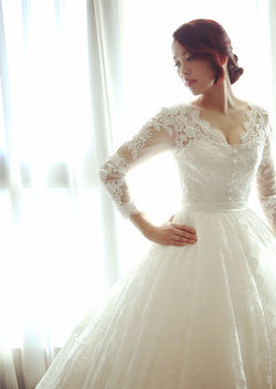 韓式妝感特別加強眼神與眼線的深邃感;不帶劉海整頭編髮充滿容光煥發真顯出氣質高雅;立領包肩蕾絲長拖尾白紗釋放出隱藏在骨子裡的女王靈魂;飾品配件部份蕾絲網紗花禮帽、珍珠耳環、白紗手套以及網紗蕾絲靴最完美的搭配,不折不扣就是一枚如假包換的韓式王妃。