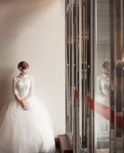 並在後腰部繫上約5米長蝴蝶潔白紗拖尾,在莊重、嚴謹、高貴的教堂婚禮氛圍下,製造出一種飄逸天使般的美麗印象。立體珍珠點綴的短頭紗更顯清純、柔柔、嫩嫩。