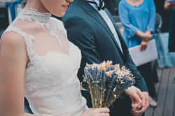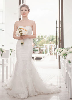 女主人公修身蕾絲A字裙擺小拖尾婚紗,搭配手工短頭紗和立體蕾絲手腕套,有一種宛如仙女下凡的美感;配上南法風情普羅旺斯捧花,呈現出耐人尋味的雋永經典!