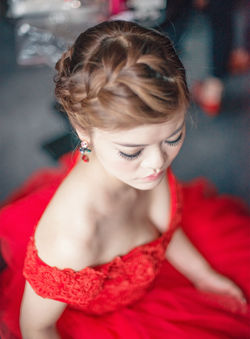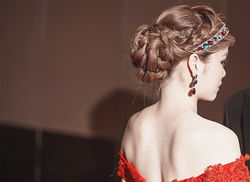 歐式宮廷穿衣類型特別能展現莊重氣勢與態度,紅色宮廷刺繡蕾絲層次裙擺大氣高貴,特別搭配華麗璀璨寶石光澤感營造巴洛克精神;手工彩色寶石髮箍,閃耀光澤搶奪在場視線閃閃動人;蝴蝶飛舞造型紙睫毛讓眨眼更有戲,彷彿一雙輕盈靈動的翅膀正閃動著,當眼睛眨呀眨呀,眼神立刻閃爍迷人;巴洛克整體奢華、浪漫、細緻裝飾感一覽無遺。