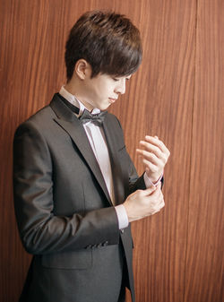 手工訂製韓版西裝禮服將男主人公長腿優勢更彰顯,為了呼應女主人公的中式蕾絲風格,特別搭配帶有暗面亮花紋黑色領結,隱隱約約光澤顯現尊貴氣質。義大利CERRUTI品牌皮帶和手工雕花牛津鞋將整體質感更加上提升。